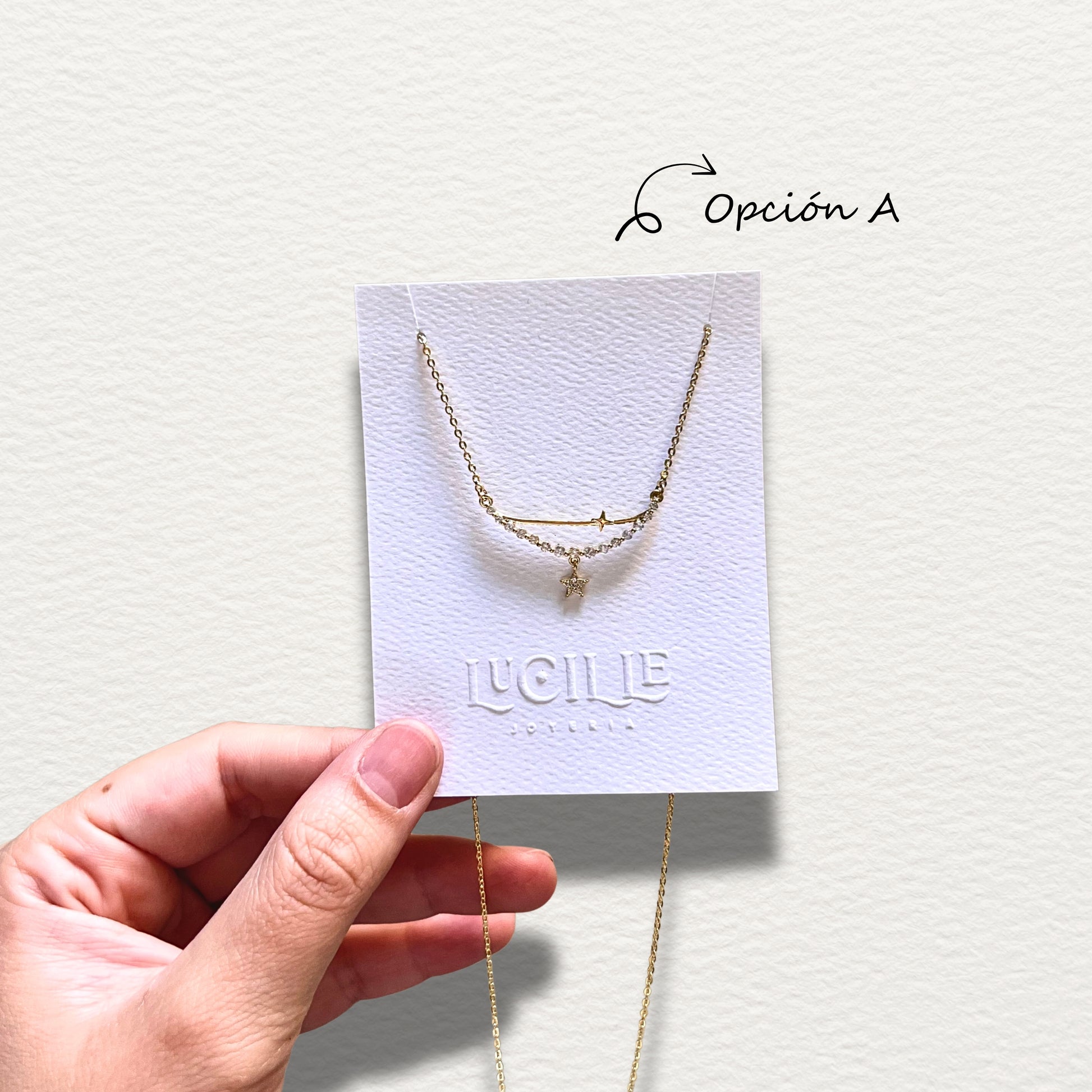 Option A: Double necklace in gold plating, with a curved bar and star pendant inlaid with cubic zirconia. A delicate and feminine design that adds light and movement.